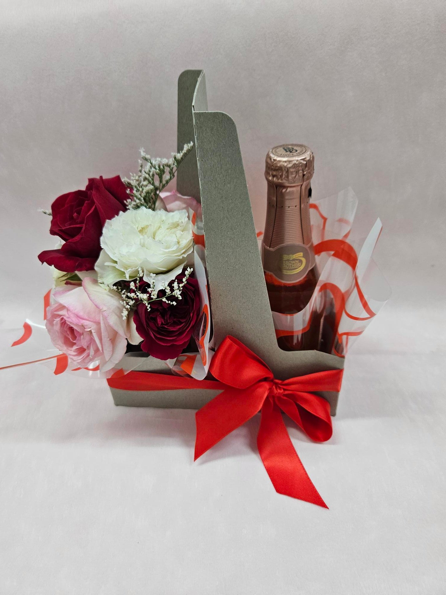 ** a selection of romantic flowers with a mini bottle of Prosecco to compliment the flowers