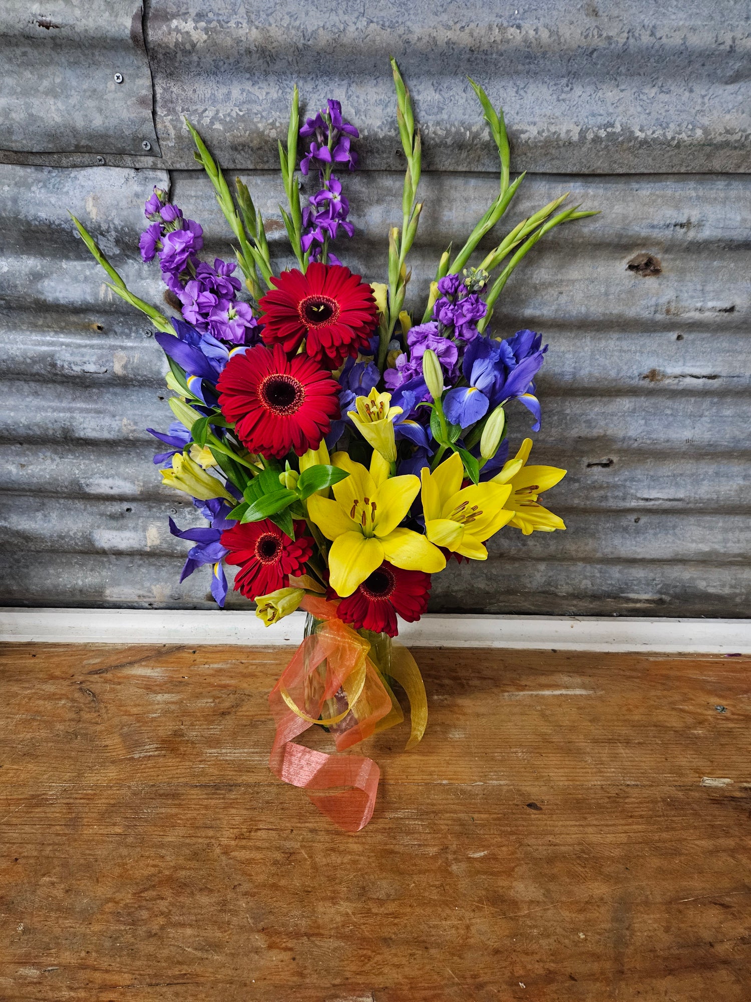 Bright selection of flowers presented in a glass vase - please note colour & flowers may vary depending on availability